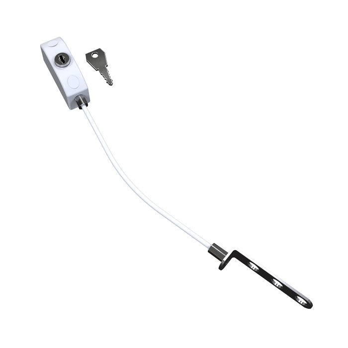 Fixes to frame to restrict opening of window with a combination of key locking facility and nylon coated steel cable. Cable can be unlocked and disengaged for ease of window cleaning, or in an emergency and is ideal for installation on windows at height to enhance safety. Supplied with 1 key and 2 fixing screws